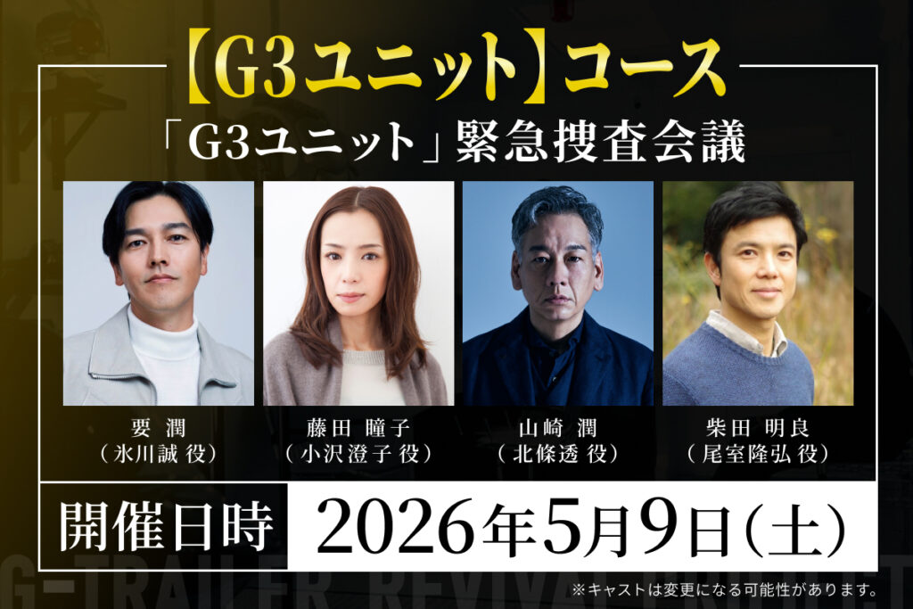 当日は、25年前の思い出から最新映画のマル秘裏話まで、ここでしか話せない門外不出のエピソードが続々と披露されるトークコーナー、G3ユニットの絆を確かめるゲームコーナー、来場者からの質問コーナー等、様々な企画をご用意しています。最初で最後(!?)の激レアイベントをお見逃しなく!!